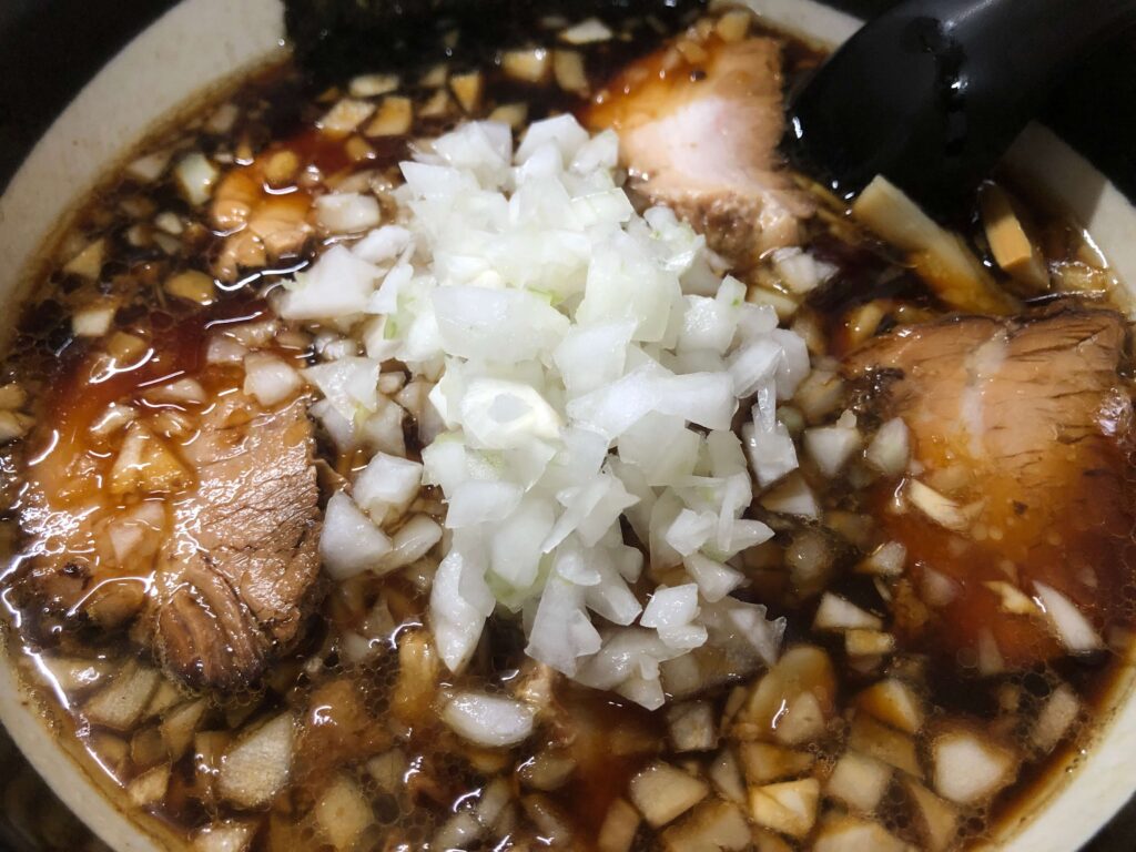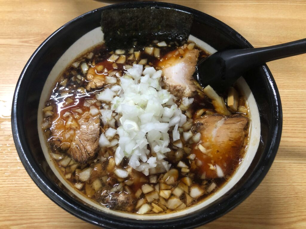 醤油ダレに麺茹湯と肉の旨みの詰まっている真っ黒なスープ、薬味に角切りの玉ねぎ、大ぶりチャーシュー、乾麺を入れたものが特徴的なラーメン。